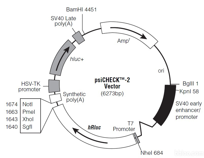 全基因合成miR潛在結合位點上下游~500bp(LncRNA、circRNA或mRNA的3’UTR)野生形式WT及結合位點的突變形式Mut,克隆到psiCHECK-2多克隆位點處(1640-1674)(圖1),然后與miR的mimics/NC共同轉染293T細胞測定熒光素酶讀值即可。