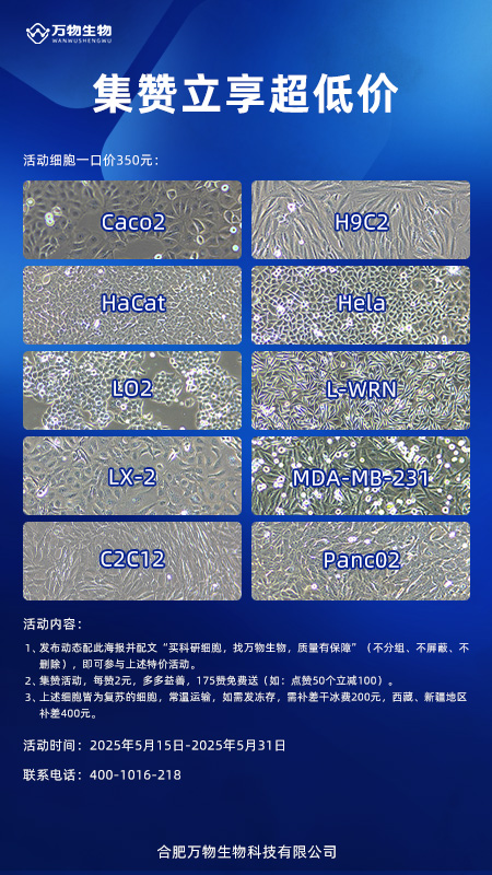 1、轉(zhuǎn)發(fā)海報并配文“買科研細(xì)胞,找萬物生物,質(zhì)量有保障”至朋友圈或小紅書(不分組、不屏蔽、不刪除),即可參與上述特價活動。