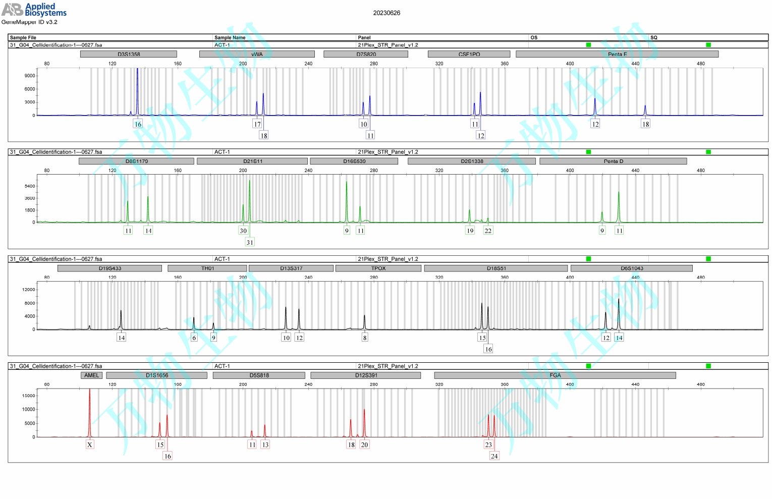 人甲狀腺未分化癌細胞(anaplastic thyroid carcinoma, ATC)。該細胞株經(jīng)過STR鑒定,與國際上ATCC、DSMZ、JCRB和RIKEN 公布的STR數(shù)據(jù)庫中8000余種細胞均不相符,排除被常見細胞系污染的可能。由于ACT-1細胞本身沒有公布可比對的STR圖譜數(shù)據(jù),我們只能初步判斷該細胞可能為ACT-1。STR結(jié)果如下:D5S818: 11,13;D13S317: 10,12;D7S820: 10,11;D16S539: 9,11;vWA: 17,18;THO1: 6,9;Amelogenin: X;TPOX: 8;CSF1PO: 11,12 |