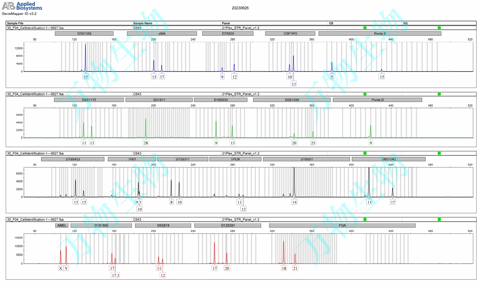 人甲狀腺未分化癌細(xì)胞(anaplastic thyroid carcinoma, ATC),未分化,C643 細(xì)胞系由 Mark 等人從一名 76 歲男性的未分化甲狀腺癌的細(xì)針活檢中建立。1987年,患者在診斷后5個(gè)月內(nèi)死亡。甲狀腺球蛋白 mRNA 的證明確定了細(xì)胞系的甲狀腺上皮來源。該細(xì)胞株經(jīng)過STR鑒定,與國(guó)際上ATCC、DSMZ、JCRB和RIKEN 公布的STR數(shù)據(jù)庫(kù)中8000余種細(xì)胞均不相符(匹配度低于80%),排除被常見細(xì)胞系污染的可能。由于C643細(xì)胞本身沒有公布可比對(duì)的STR圖譜數(shù)據(jù),我們只能初步判斷該細(xì)胞可能為C643。 STR結(jié)果如下:D5S818: 11,12;D13S317: 8,10;D7S820: 9,12;D16S539: 9,13;vWA: 15,17;THO1: 9.3,10;Amelogenin: X,Y;TPOX: 11,12;CSF1PO: 10,11 |