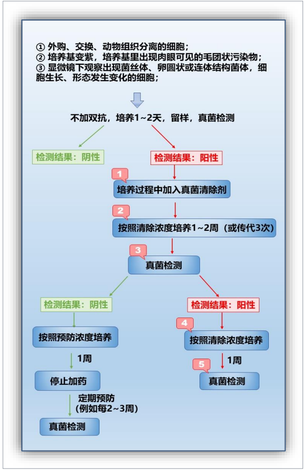 ③真菌清除干凈后,必須進(jìn)行傳代并鋪入新的細(xì)胞培養(yǎng)瓶,且在新瓶中加藥維持1~2天后,才可以撤掉真菌清除劑,避免在舊瓶中撤藥后舊瓶壁上的真菌或孢子殘留造成二次污染;
