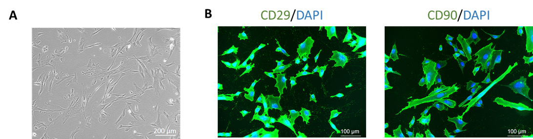 圖1。人臍帶間充質(zhì)干細胞。(A)HUMSC的相位對比圖像。(B)用抗CD29和CD90的抗體進行免疫熒光染色。