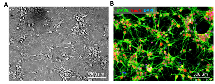 圖 1.大鼠皮層神經(jīng)元被回收并培養(yǎng) 5 天。(A) 相襯圖像。(B) 使用針對神經(jīng)元標(biāo)記物 MAP2(綠色)和 NeuN(紅色)的抗體進行免疫熒光染色。