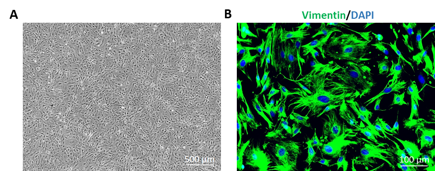 圖 1:(A)在恢復(fù)后 7 天拍攝的大鼠支持細(xì)胞 (RSC) 的相差圖像。(B) RSC 對(duì)波形蛋白呈陽(yáng)性,如免疫熒光染色所示。
