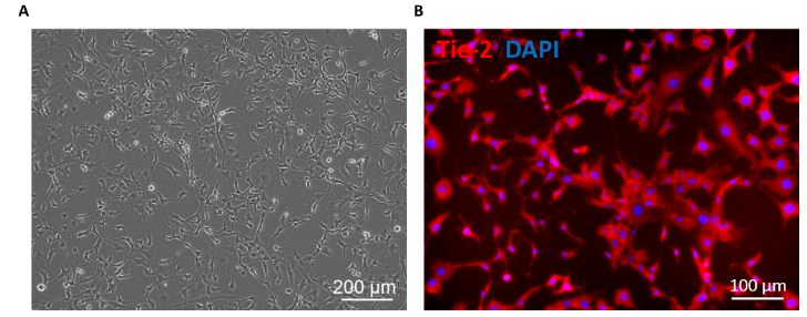 圖 1. 小鼠肺內(nèi)皮細(xì)胞 (MPEC)。 (A) MPEC 的相襯圖像。(B) 使用抗 Tie-2 的抗體進(jìn)行免疫熒光染色。