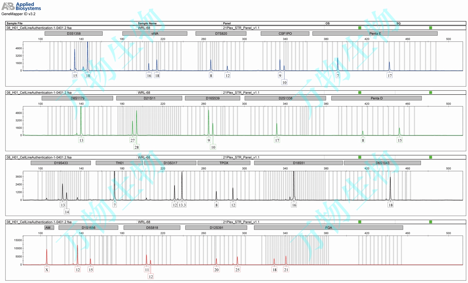 該株細(xì)胞DNA分型在細(xì)胞系檢索中找到完全匹配的細(xì)胞系,DSMZ數(shù)據(jù)庫(kù)顯示細(xì)胞名為WRL 68,細(xì)胞號(hào)對(duì)應(yīng)CL-48。Problematic cell line: Contaminated. Shown to be a HeLa derivative (PubMed=26116706).細(xì)胞STR位點(diǎn)信息:D5S818:11,12;D13S317:12,13.3;D7S820:8,12;D16S539:9,10;VWA :16,18;TH01:7,7;AMEL:X,X; TPOX :8,12; CSF1PO :9,10; |