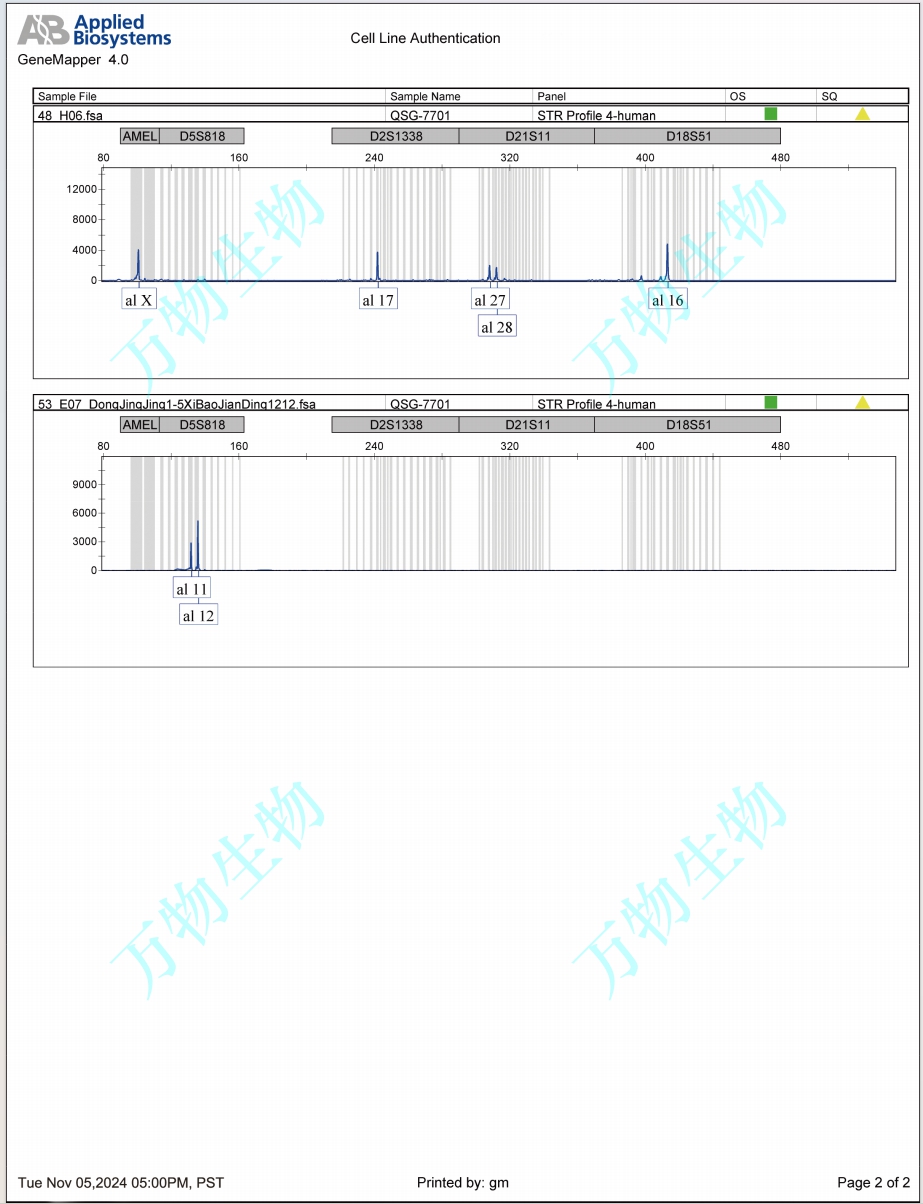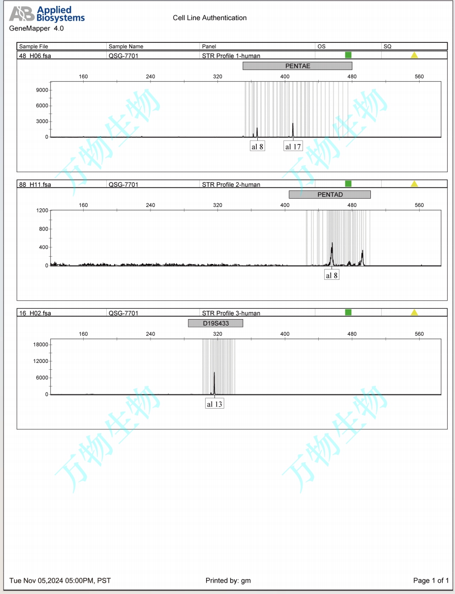 該細胞系來自30歲女性的肝癌癌旁組織。該株細胞DNA分型在細胞系檢索中找到基本匹配的細胞系,CRC數(shù)據(jù)庫顯示細胞名為QSG-7701,細胞號對應(yīng)3131C0001000200007。Problematic cell line: Contaminated. Shown to be a HeLa derivative (PubMed=26116706)。細胞STR位點信息:D5S818:11,12;D13S317:8,14;D7S820:12,12;D16S539:9,10;VWA :16,18;TH01:7,7;AMEL:X,X; TPOX :12,12; CSF1PO :10,10; |