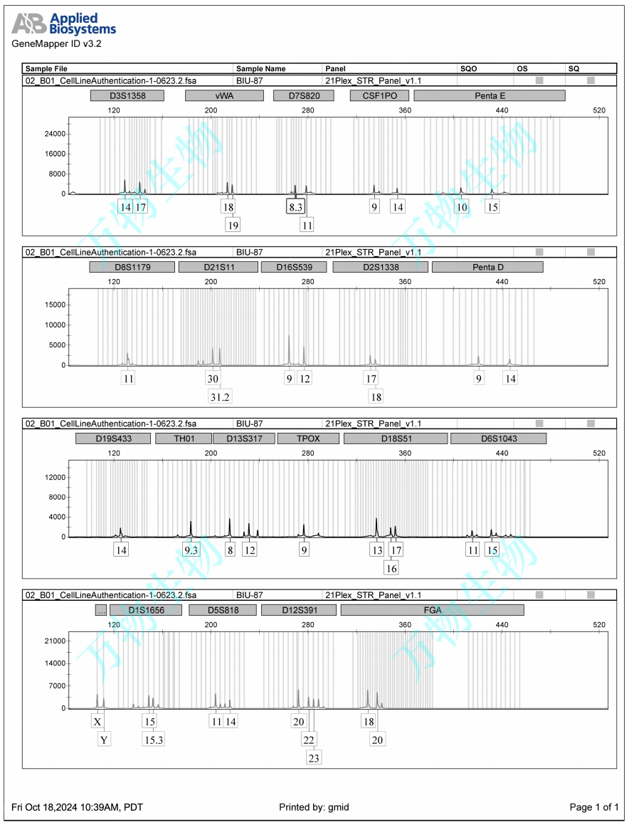BIU-87細胞是由俞莉章等建系于1989年;BIU-87細胞來源于人膀胱乳頭狀移行上皮癌,通常采用5×108細胞、0.2ml的接種體積接種至裸鼠皮下;BIU-87細胞呈進行性腫瘤生長,腫瘤結(jié)節(jié)病檢與原標本癌組織相似。BIU-87細胞22代群體倍增時間為34小時;BIU-87細胞能在軟瓊脂上生長,克隆形成率23%。BIU-87細胞對ConA、WGA、PSL均有凝集反應(yīng)。Problematic cell line: Misidentified/contaminated. Seems to be contaminated by non-human cells (PubMed=26116706). Originally thought to originate from a 58 year old male patient with an urinary bladder carcinoma. |