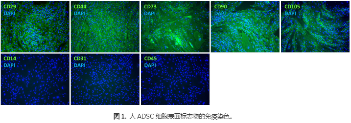 萬物生物提供來自單一供體脂肪組織的正常人脂肪干細(xì)胞 (hADSC),并在第 1 代冷凍保存。 hADSC 對(duì) CD29、CD44、CD73、CD90、CD105 呈陽性,對(duì) CD14、CD31、CD45 呈陰性(圖1 )。hADSC 可以分別使用脂肪細(xì)胞分化培養(yǎng)基和成骨分化培養(yǎng)基在體外分化為脂肪細(xì)胞和成骨細(xì)胞(圖 2 和 3)。可以使用脂肪衍生的干細(xì)胞生長培養(yǎng)基將 hADSC 進(jìn)一步擴(kuò)增 3-4代。這些細(xì)胞對(duì) HIV-1、HBV、HCV、支原體、細(xì)菌、酵母和真菌呈陰性。