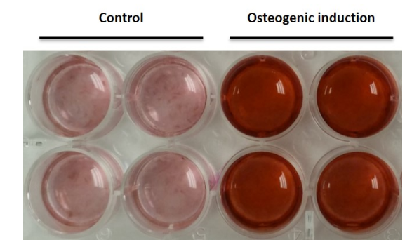 圖 3.人類 ADSC 成骨誘導(dǎo)(成骨誘導(dǎo)后第 24 天)。成骨細(xì)胞的茜素紅 S 染色。細(xì)胞外鈣沉積被染成明亮的橙紅色。