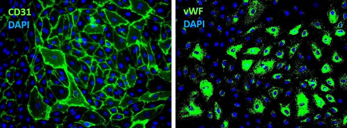 萬物生物提供高質(zhì)量的HDMVEC,它是從人體皮膚中分離出來的,在P2冷凍保存,每個小瓶中有3E0.5萬個細(xì)胞。HDMVEC表達(dá)vWF/因子VIII和CD31(圖1),對HIV-1、HBV、HCV、支原體、細(xì)菌、酵母和真菌呈陰性。