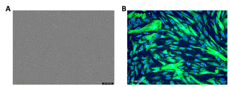 圖1。人腦血管周細(xì)胞。(一)HBVP的相位對(duì)比圖像。(二)抗α平滑肌肌動(dòng)蛋白抗體免疫熒光染色。