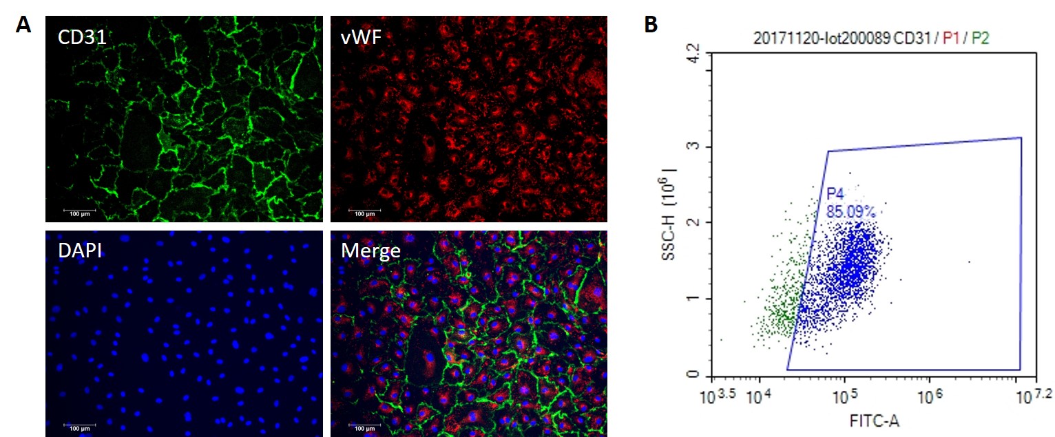 圖1。(一)vWF(紅色)和CD31(綠色)的免疫熒光染色。(二)流式細胞分析顯示85.09%的細胞CD31陽性。