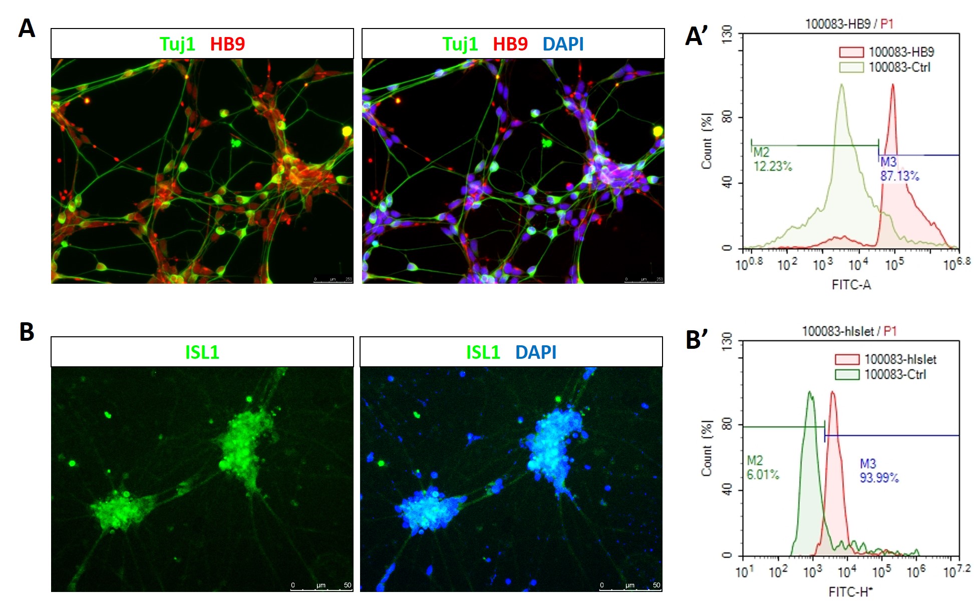 圖1。在基質(zhì)凝膠包被的板上的運(yùn)動(dòng)神經(jīng)元維持培養(yǎng)基中培養(yǎng)2天后,超過85%的iPSC衍生的運(yùn)動(dòng)神經(jīng)元表達(dá)HB9(圖A和A’),超過90%的細(xì)胞表達(dá)ISL1(圖B and B’)。