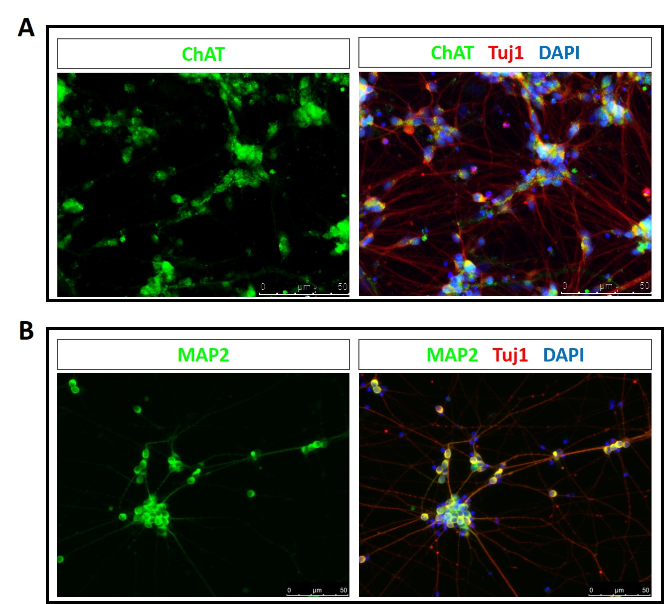 萬物生物提供世界上第一個(gè)商業(yè)化的人類iPSC衍生運(yùn)動(dòng)神經(jīng)元。iXCells源自hiPSC的運(yùn)動(dòng)神經(jīng)元表達(dá)運(yùn)動(dòng)神經(jīng)元的典型標(biāo)記,例如HB9 (MNX1)、ISL1、CHAT(圖1和圖2),純度高于85%。iPSC來源的運(yùn)動(dòng)神經(jīng)元的功能驗(yàn)證已經(jīng)在神經(jīng)肌肉接頭形成中完成。