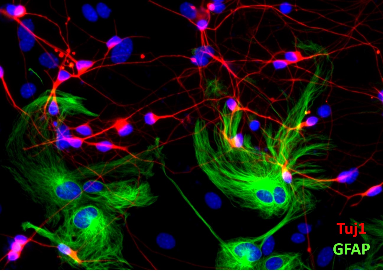 圖3。 hiPSC衍生的運(yùn)動(dòng)神經(jīng)元與小鼠星形膠質(zhì)細(xì)胞共培養(yǎng)7天。運(yùn)動(dòng)神經(jīng)元用Tuj1染色,小鼠星形膠質(zhì)細(xì)胞用GFAP染色。