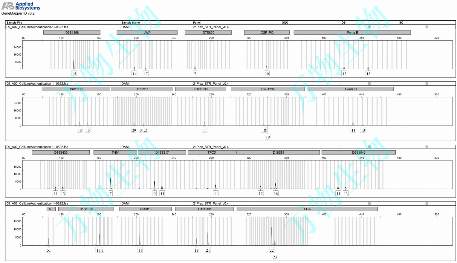 從一個巨核細胞白血病患者的血液建立了一株新的人類巨核細胞(Dami)。 此細胞懸浮生長為主,倍增時間24-30小時。至少89%的細胞可與血小板糖蛋白(GP) lb and Ilb/llla及血型糖蛋白單克隆抗體反應(yīng)。不與抗淋巴腺、單核細胞、粒性白細胞、巨噬細胞抗原的抗體反應(yīng)。Dami細胞為研究巨核細胞生化及分化提供了極好的模型。Problematic cell line: Contaminated. Shown to be a HeL derivative . 該細胞STR位點信息:D5S818:11,11;D13S317:9,11;D7S820:7,7;D16S539:11,11;VWA :14,17;TH01:7,7;AMEL:X,X; TPOX :11,11; CSF1PO :10,10; |